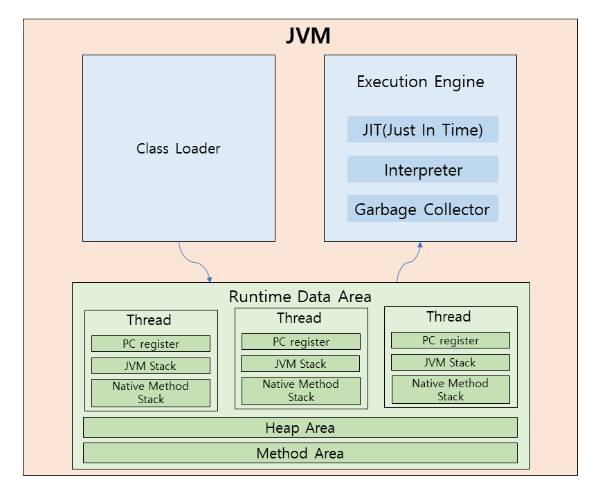 3) Execution Engine(실행 엔진): 클래스 파일을 실행시키는 방법에 따라 크게 인터프리터, JIT 컴파일러로 구분된다.
